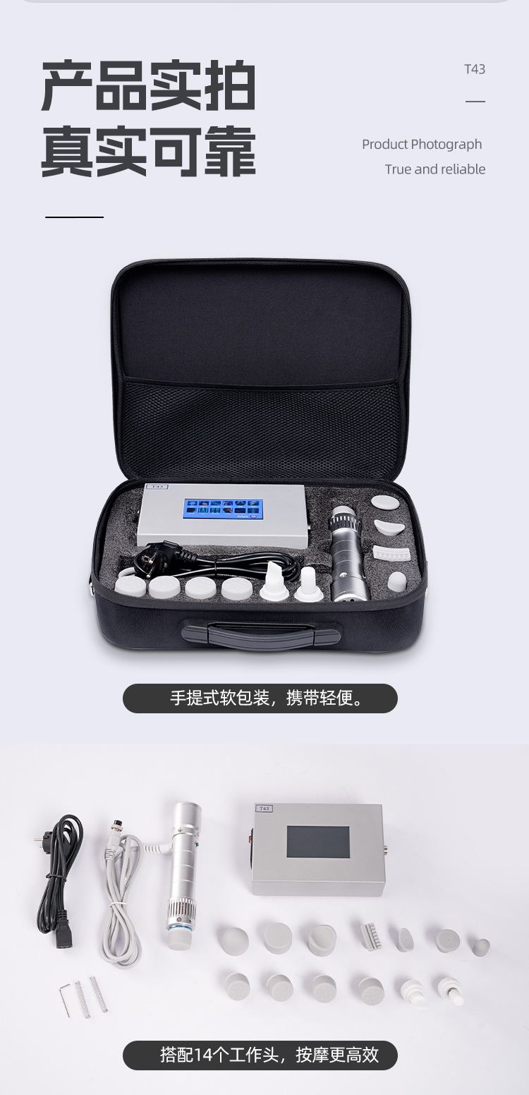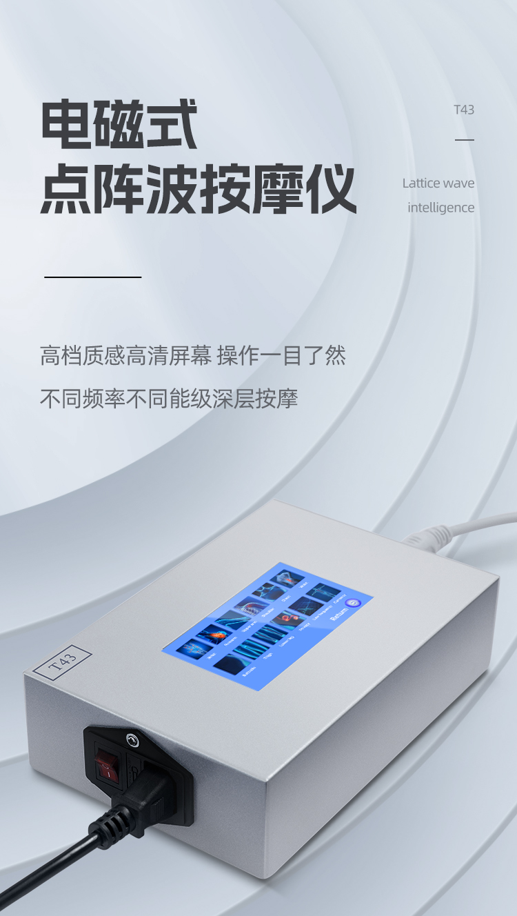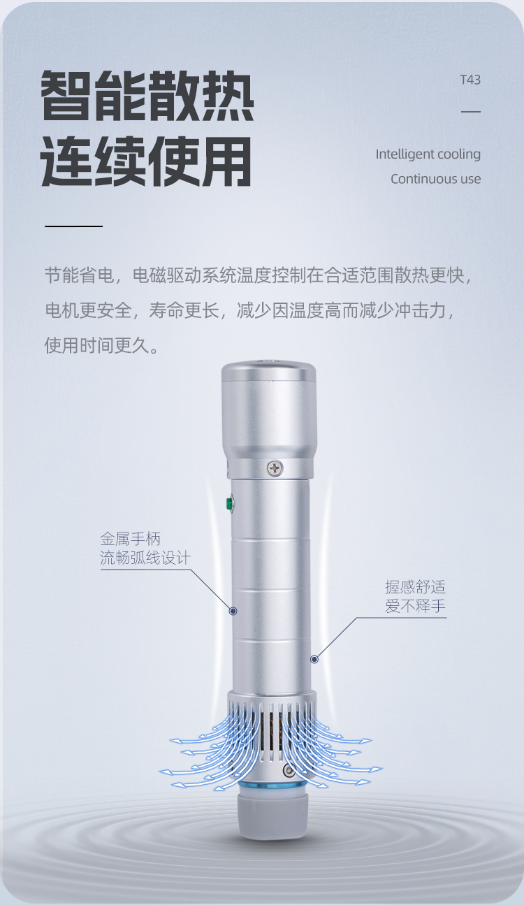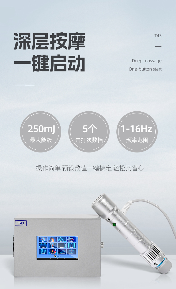【產(chǎn)品名稱】T43電磁沖擊按摩儀 【產(chǎn)品簡述】電磁點(diǎn)陣波利用脈沖電流通過線圈產(chǎn)生磁場,推動(dòng)彈體運(yùn)動(dòng)產(chǎn)生點(diǎn)陣波,實(shí)現(xiàn)聚焦,平射,或散射深入到筋膜層?!局饕攸c(diǎn)】1、高效調(diào)理:能夠提供高能量的沖擊波,深入組織,加速組織修復(fù)和再生,從而達(dá)到調(diào)理效果。 2、多功能應(yīng)用:可用于多種不適的調(diào)理,如骨骼肌肉、關(guān)節(jié)、腱鞘等。 3、精準(zhǔn)定位:通過定位準(zhǔn)確,在接觸皮膚的部位涂抹耦合劑,便可進(jìn)行調(diào)理。 4、安全可靠:具有組織損傷修復(fù)作用、組織粘連松解作用、神經(jīng)末梢封閉作用、擴(kuò)張血管作用等多種作用,因此對疾病有很好的治療效果。 5、無創(chuàng)無痛:無需進(jìn)行切開、注射等操作,只需定位準(zhǔn)確,然后在接觸皮膚的部位涂抹耦合劑,便可進(jìn)行調(diào)理。 適用范圍廣:適用于80%以上慢性酸脹。