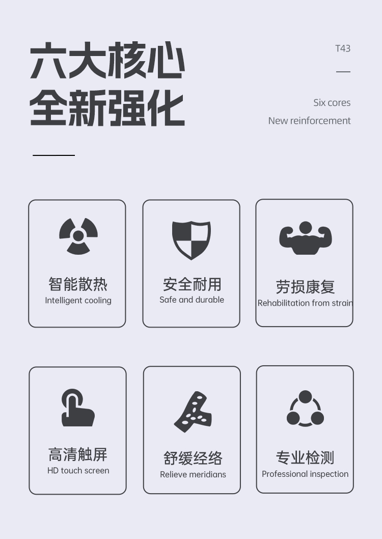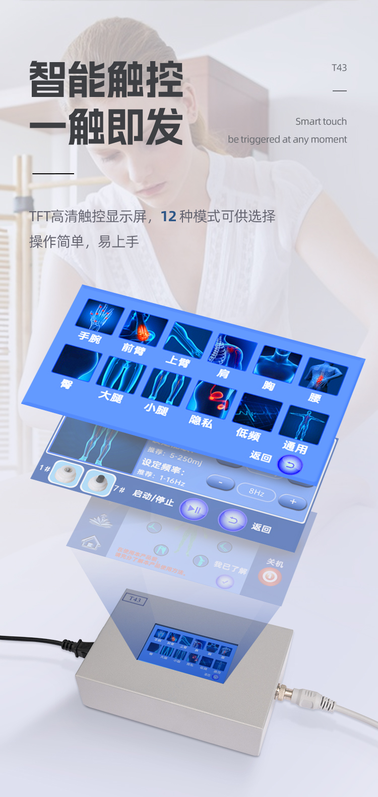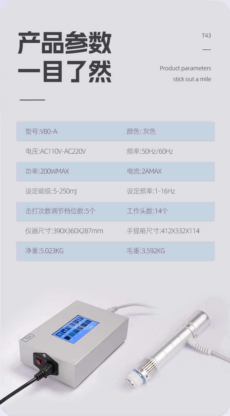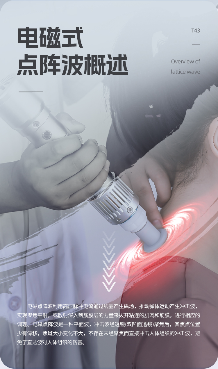【產(chǎn)品名稱】T43電磁沖擊按摩儀 【產(chǎn)品簡述】電磁點(diǎn)陣波利用脈沖電流通過線圈產(chǎn)生磁場,推動(dòng)彈體運(yùn)動(dòng)產(chǎn)生點(diǎn)陣波,實(shí)現(xiàn)聚焦,平射,或散射深入到筋膜層?!局饕攸c(diǎn)】1、高效調(diào)理:能夠提供高能量的沖擊波,深入組織,加速組織修復(fù)和再生,從而達(dá)到調(diào)理效果。 2、多功能應(yīng)用:可用于多種不適的調(diào)理,如骨骼肌肉、關(guān)節(jié)、腱鞘等。 3、精準(zhǔn)定位:通過定位準(zhǔn)確,在接觸皮膚的部位涂抹耦合劑,便可進(jìn)行調(diào)理。 4、安全可靠:具有組織損傷修復(fù)作用、組織粘連松解作用、神經(jīng)末梢封閉作用、擴(kuò)張血管作用等多種作用,因此對疾病有很好的治療效果。 5、無創(chuàng)無痛:無需進(jìn)行切開、注射等操作,只需定位準(zhǔn)確,然后在接觸皮膚的部位涂抹耦合劑,便可進(jìn)行調(diào)理。 適用范圍廣:適用于80%以上慢性酸脹。
