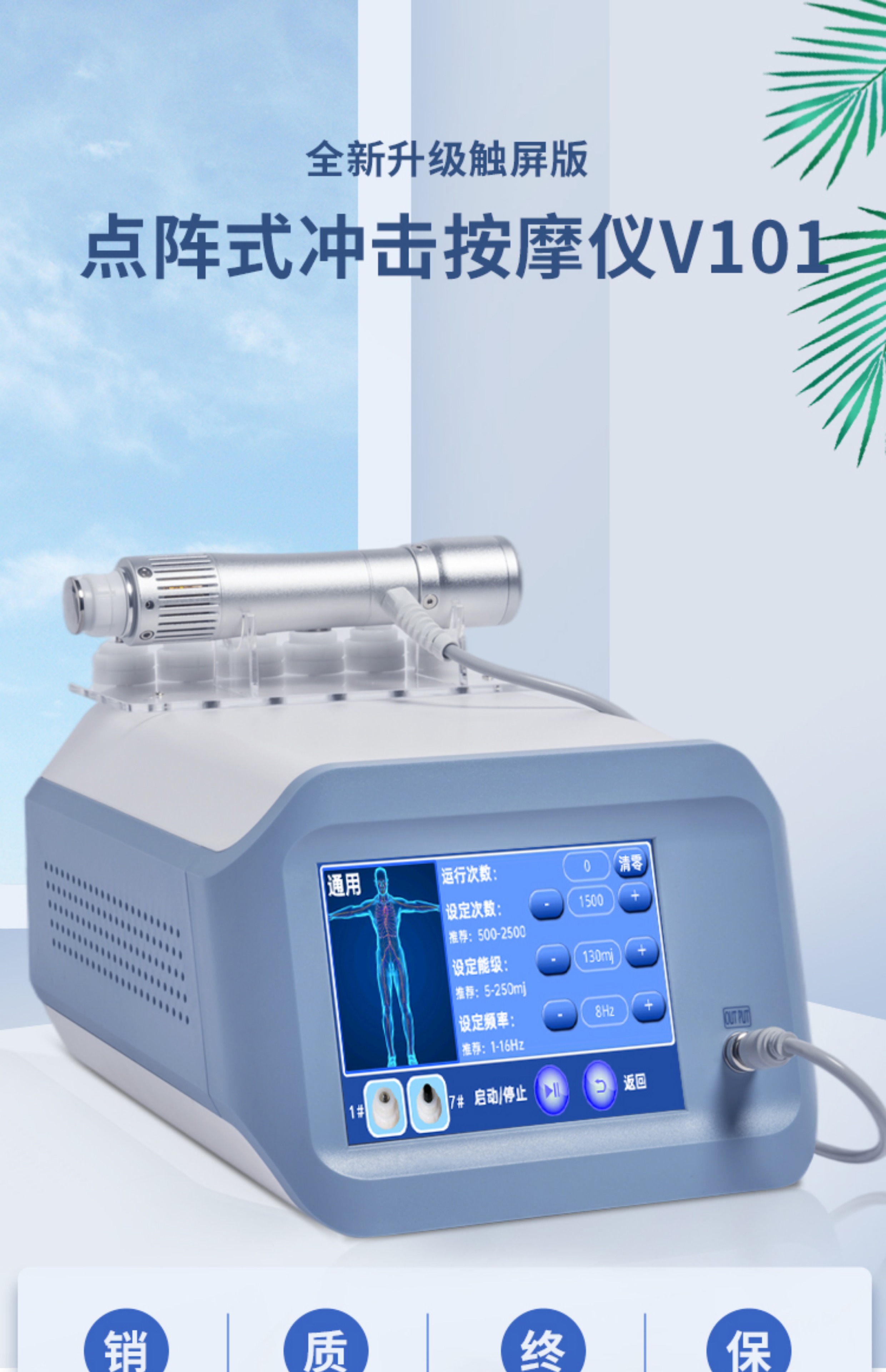 【產(chǎn)品名稱】V101智能沖擊按摩儀?!井a(chǎn)品概述】電磁點(diǎn)陣波利用脈沖電流通過線圈產(chǎn)生磁場(chǎng),推動(dòng)彈體運(yùn)動(dòng)產(chǎn)生點(diǎn)陣波,實(shí)現(xiàn)聚焦,平射,或散射深入到筋膜層,進(jìn)行相應(yīng)的調(diào)理,對(duì)于肌肉長(zhǎng)期勞損的人來說,點(diǎn)陣沖擊波帶來的感覺是疼和震。因?yàn)榧∪馐艿介L(zhǎng)期積壓,與筋膜粘連,肌肉和筋膜的位置已經(jīng)比較扭曲,要撥開粘連的肌肉和筋膜,就需要用能夠深入到筋膜層的力量來?yè)荛_二者,令其回歸正確自然的位置上。